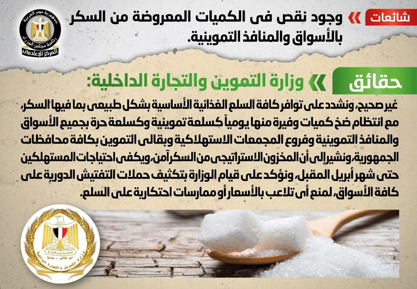 وأكدت وزارة التموين والتجارة الداخلية أنه لا صحة لوجود نقص في الكميات المعروضة من السكر بالأسواق والمنافذ التموينية، مُشددةً على توافر كافة السلع الغذائية الأساسية بشكل طبيعي بما فيها السكر، مع انتظام ضخ كميات وفيرة منها يومياً كسلعة تموينية وكسلعة حرة بجميع الأسواق والمنافذ التموينية وفروع المجمعات الاستهلاكية وبقالي التموين بكافة محافظات الجمهورية.