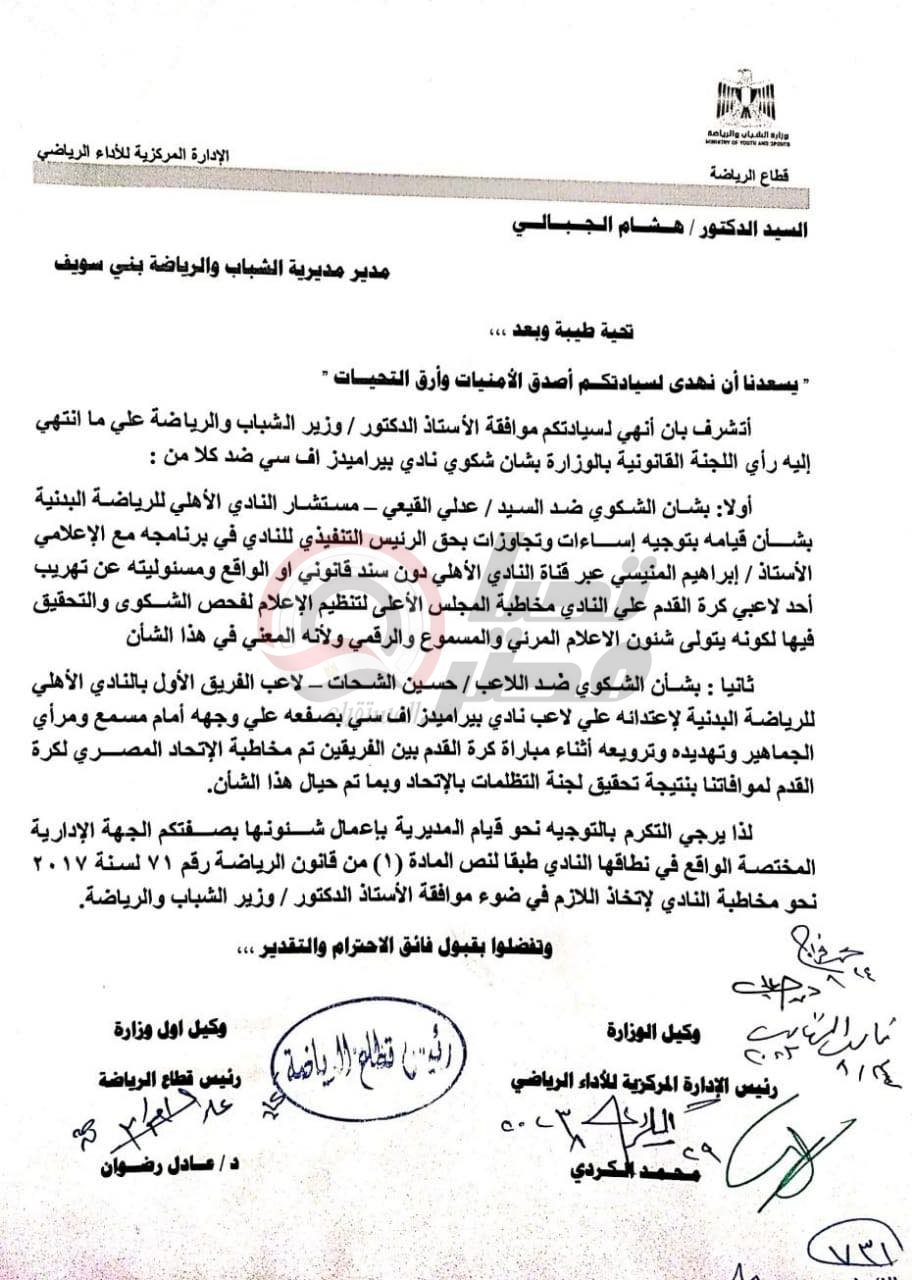 الرياضة تطلب إحالة القيعي والمنيسي للإعلام والتحقيق الفوري في واقعة الشحات (مستند)