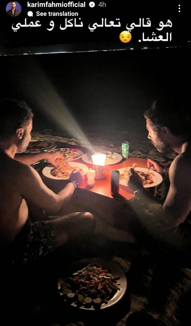 وعلق كريم فهمي على الصورة خلال خاصية استوري، وكتب: "هو قالي تعالى ناكل وعملي العشاء"، وقد اجتاحت الصورة جميع مواقع التواصل الاجتماعي، نظرًا لأنها جاءت بعد فترة من انتشار شائعة خلافهما.
