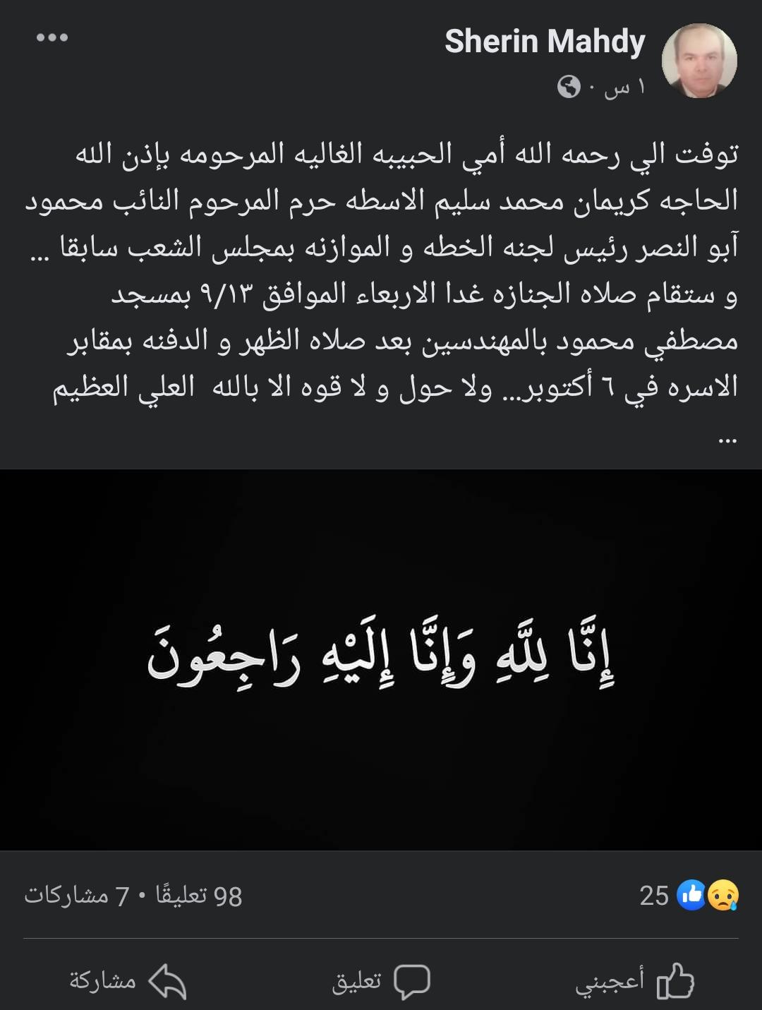 وكتب شيرين: توفت إلى رحمة الله أمي الحبيبة الغالية المرحومة بإذن الله الحاجة كريمان محمد سليم الاسطه، حرم المرحوم النائب محمود أبو النصر رئيس لجنة الخطة والموازنة بمجلس الشعب سابقا.