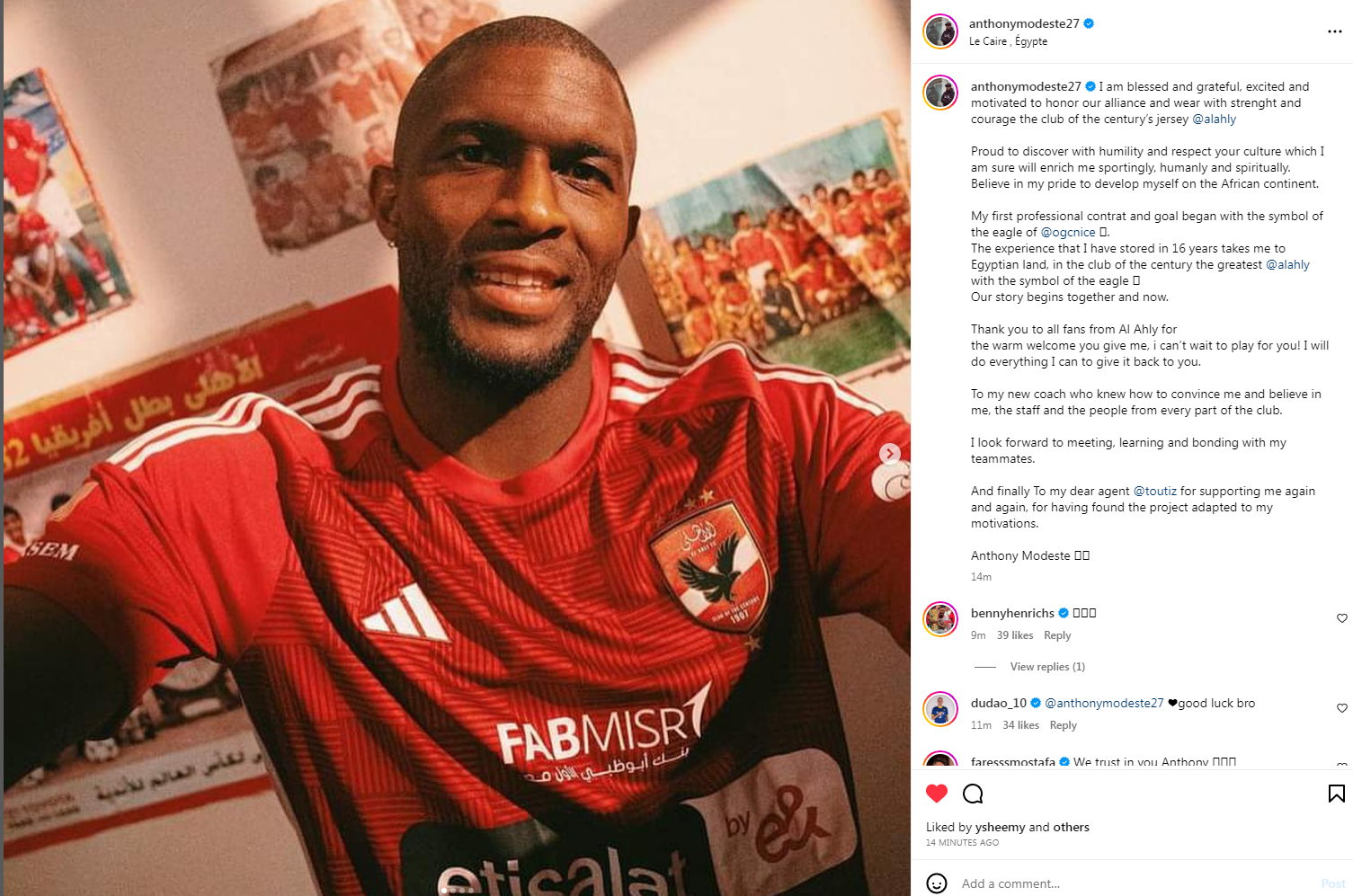 وكتب أنتوني موديست مهاجم النادي الأهلي، عبر حسابه الرسمي"إنستجرام":" أنا مبارك وممتن، متحمس ومتحمس لتكريم تحالفنا وارتداء قميص نادي القرن بقوة وشجاعة".