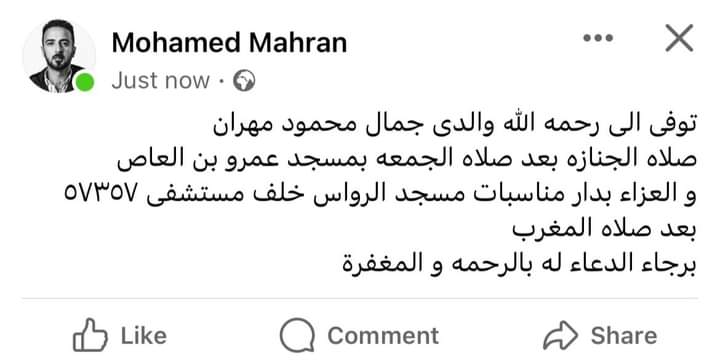 وكتبت محمد مهران عبر حسابه الرسمي بموقع فيسبوك: توفى الى رحمه الله والدى جمال محمود مهران، صلاه الجنازه بعد صلاة الجمعة بمسجد عمرو بن العاص.
