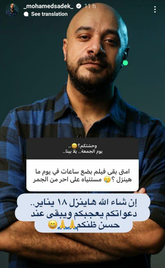 حيث جاء لمحمد صادق سؤالًا من أحد المتابعين عن موعد طرح فيلم بضع ساعات في يوم ما، فرد عليه وكتب: "إن شاء الله هينزل 18 يناير.. دعواتكم يعجبكم ويبقى عند حسن ظنكم".