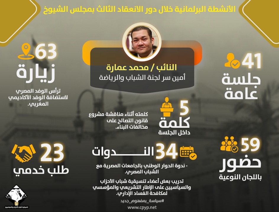 تحيا مصر ينشر النشاط البرلماني لنائب التنسيقية محمد عمارة خلال دور الانعقاد الثالث لمجلس الشيوخ