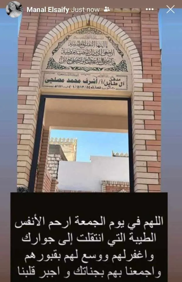 ونشرت منال الصيفي صورة لها من قبر زوجها عبر حسابها الرسمي بموقع تبادل الصور والفيديوهات انستجرام من خلال خاصية "ستوري": اللهم في يوم الجمعة ارحم الأنفس الطيبة التي انتقلت إلى جوارك، واغفر لهم ووسع لهم بقلوبهم واجمعنا بهم بجناتك واجبر قلبنا بعدهم.