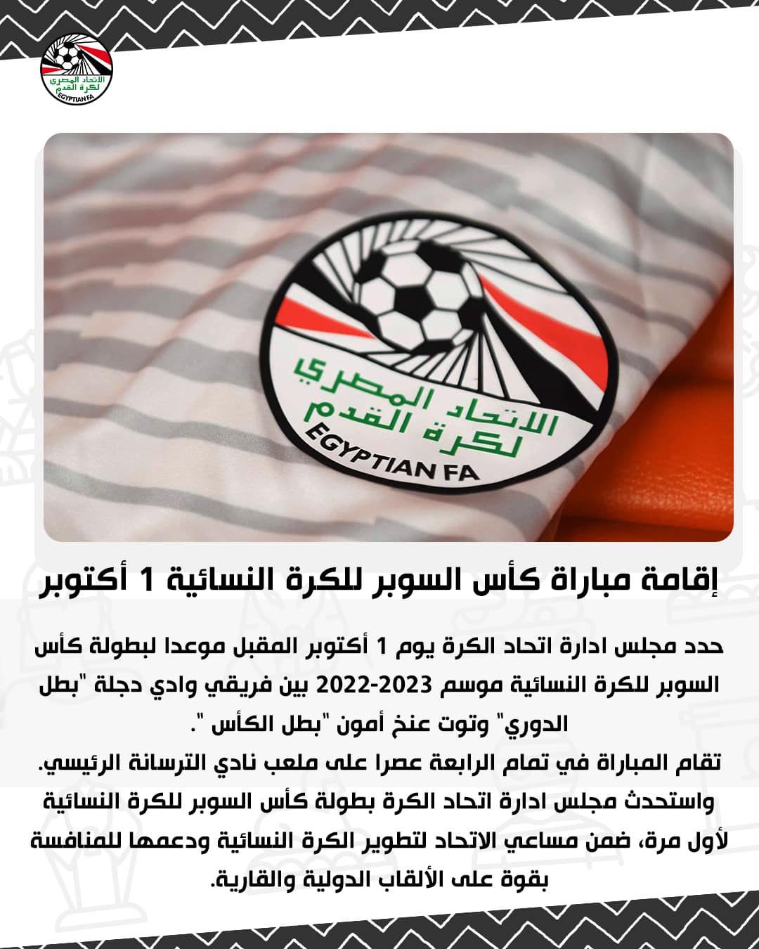 حدد مجلس ادارة اتحاد الكرة ، يوم 1 أكتوبر المقبل موعدا لبطولة كأس السوبر للكرة النسائية موسم 2022 / 2023 بين فريقي وادي دجلة " بطل الدوري " وتوت عنخ أمون " بطل الكأس ، وتقام المباراة في تمام الرابعة عصرا علي ملعب نادي الترسانة الرئيسي.
