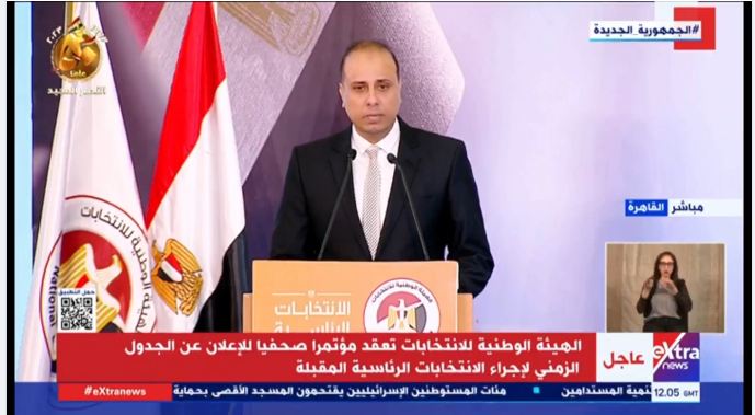 قدم الإعلامي أحمد غنيم، المؤتمر الصحفي للهيئة الوطنية للانتخابات، وذلك للإعلان عن الجدول الزمني لانتخابات رئاسة الجمهورية 2024.