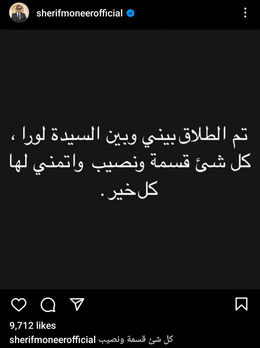 أعلن الفنان شريف منير انفصاله عن زوجته لورا، من خلال منشور عبر حسابه الشخصي على موقع تبادل الصور والفيديوهات إنستجرام.