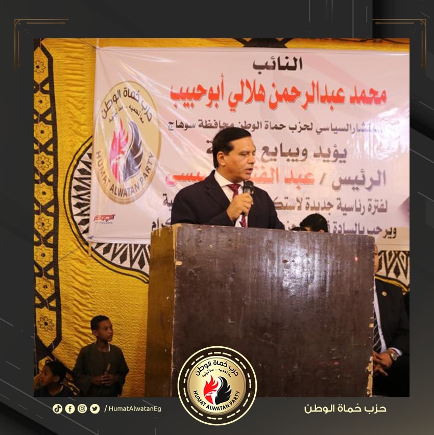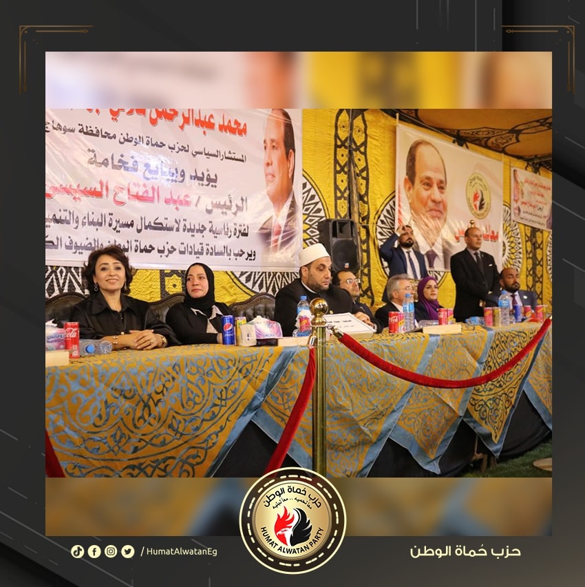 كما نظم حزب حماة الوطن بسوهاج، مؤتمرًا جماهيريًا حاشدًا في إطار حملة حزب حماة الوطن لدعم الرئيس عبد الفتاح لفترة رئاسية جديدة، بحضور اللواء أحمد العوضي النائب الأول لرئيس حزب حماة الوطن، واللواء طارق نصير الأمين العام لحزب حماة الوطن، والنائبة ميرال الهريدي أمينة التعليم، والدكتور عمرو سليمان أمين الأمانات النوعية، والدكتور عمرو صدقي أمين الأنشطة السياحية، والشيخ أحمد تركي أمين الشئون الدينية، والدكتورة ناريمان الرفاعي أمينة التضامن، والدكتورة مها الأنصاري أمينة التواصل الشعبي والجماهيري، والعمدة بهاء سليم أمين أمانة الفلاحين، والدكتور يحيي هاشم أمين التنمية البشرية، والدكتور أحمد الديب الخولي أمين عام محافظة سوهاج>