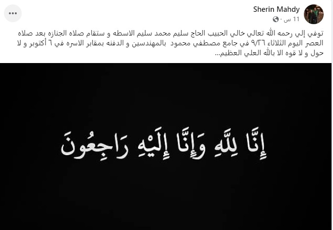 وأعلن نجل الفنانة كاريمان والمدعو شيرين مهدي عبر حسابه الرسمي بموقع التواصل الاجتماعي “فيسبوك”، وفاة خاله، حيث كتب معلنًا عن موعد ومكان الجنازة: خالي الحبيب الحاج سليم محمد سليم الأسطة، وستقام صلاة الجنازة بعد صلاة العصر اليوم الثلاثاء، في جامع مصطفى محمود بالمهندسين، والدفنة بمقابر الأسرة في 6 أكتوبر ولا حول ولا قوة، إلا بالله العلي العظيم.