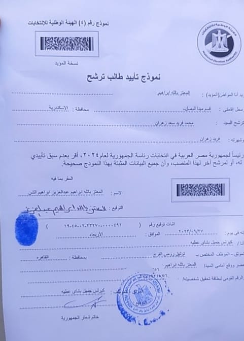 أعلن الدكتور معتز الشناوي، المتحدث الرسمي لحزب العدل، تحريره لتوكيل لتأييد المرشح الرئاسي فريد زهران.