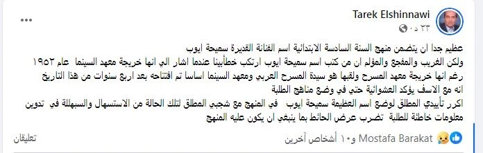 طرق الشناوي: من كتب اسم سميحة أيوب ارتكب خطأ في منهج 6 إبتدائي