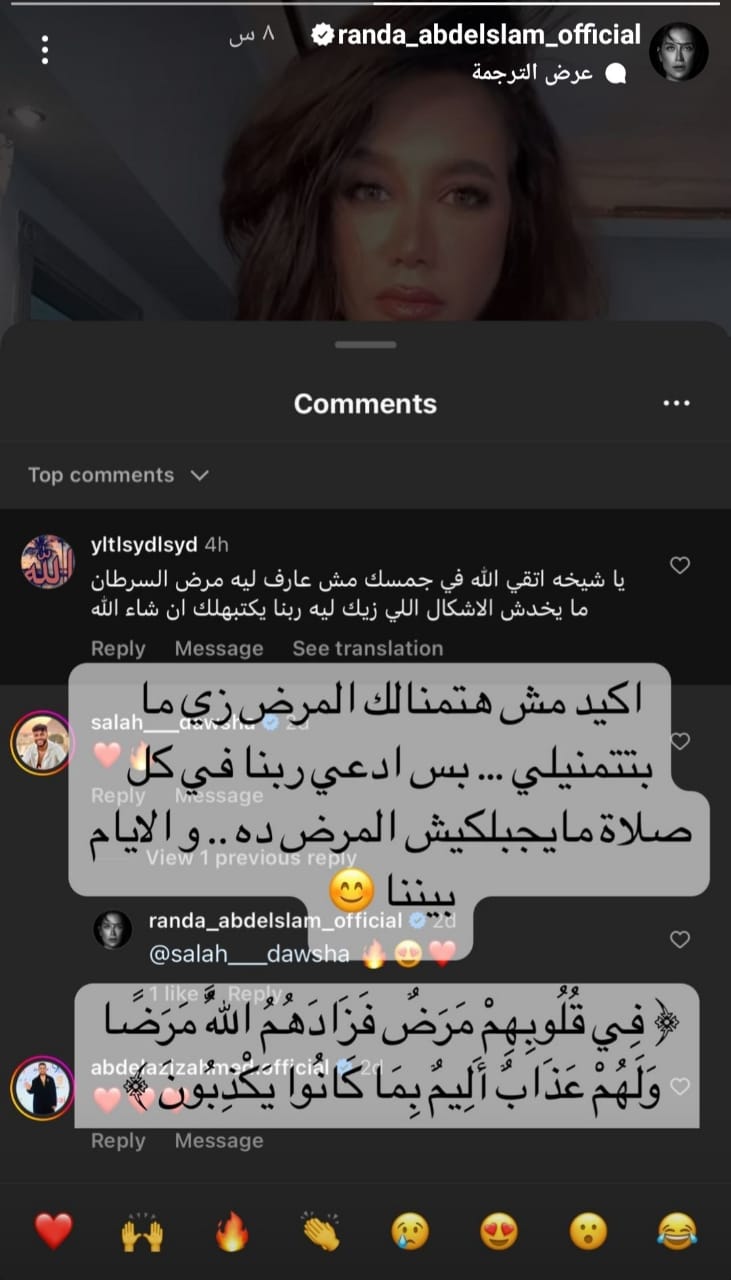 ومن جانبها، ردت راندا عبد السلام على تعليق المتابع من خلال خاصية استوري، قائلًا: أكيد مش هتمنالك المرض زي ما بتتمنه ليا.. بس ادعي ربنا في كل صلاة مايجبلكش المرض دا.. والأيام بيننا.