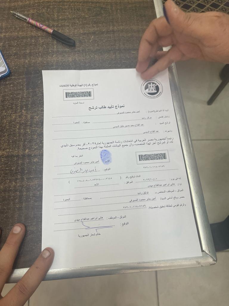 وقع النائب أمين جابر الصيرفي عضو لجنة العلاقات الخارجية والعربية والإفريقية بمجلس الشيوخ،وأعضاء هيئة مكتبه بالشهر العقارى بمدينة رشيد،على استمارات توكيلات للرئيس عبد الفتاح السيسي، وذلك لتقديمها للهيئة الوطنية للانتخابات ضمن أوراق الترشح لانتخابات رئاسة الجمهورية.