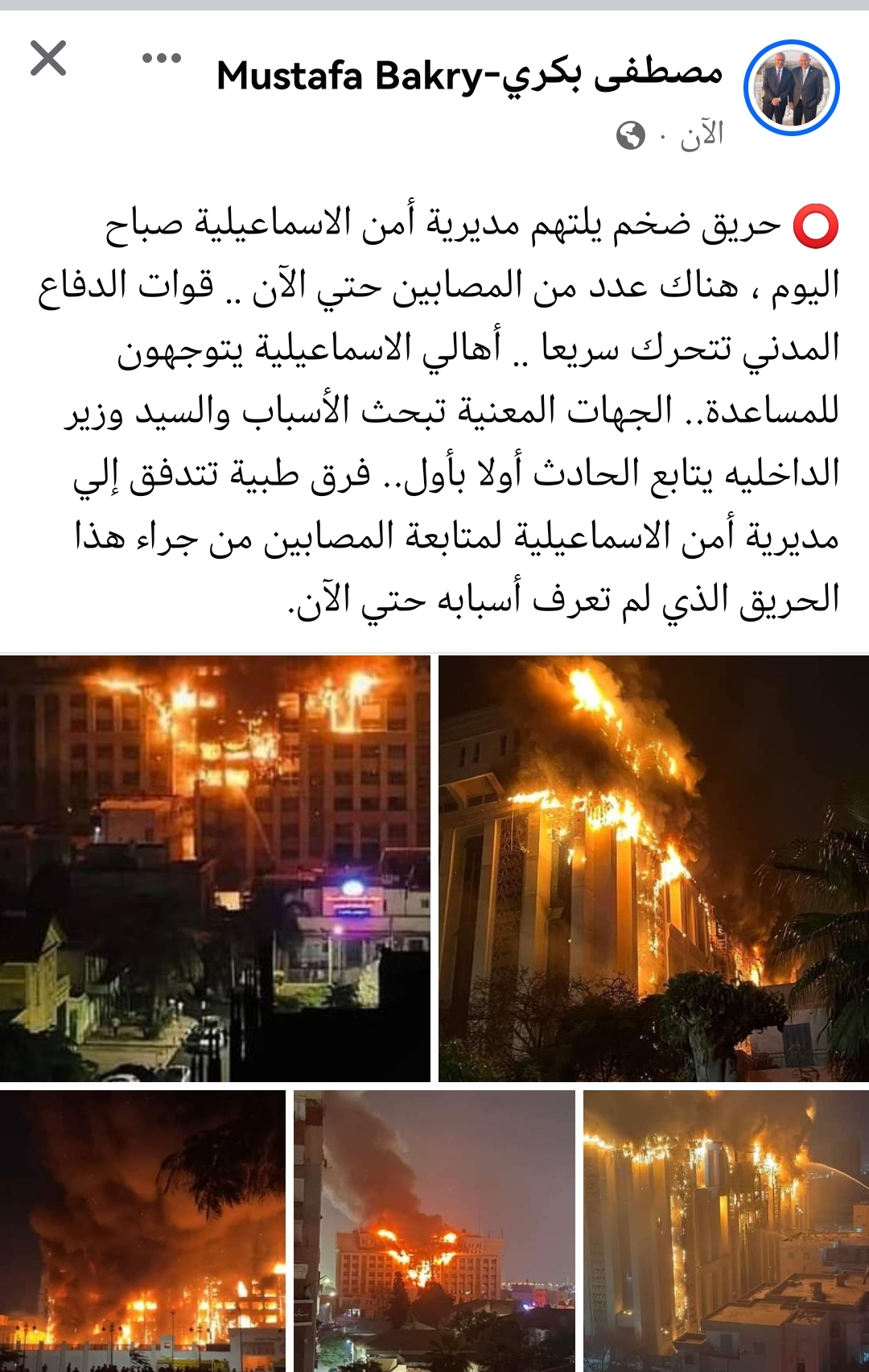 من ناحيته قال النائب مصطفى بكري، عضو مجلس النواب ان حريق ضخم التهم مديرية أمن الاسماعيلية صباح اليوم ، وهناك عدد من المصابين حتي الآن.