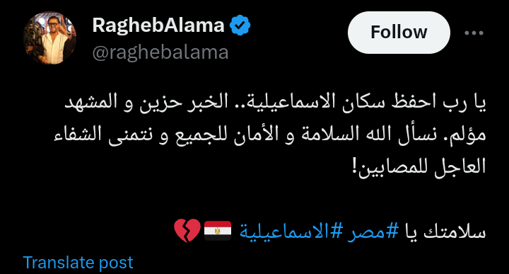 وكتب راغب علامة عبر حسابه الرسمي بموقع التواصل الاجتماعي تويتر: يا رب احفظ سكان الاسماعيلية.. الخبر حزين و المشهد مؤلم. نسأل الله السلامة و الأمان للجميع و نتمنى الشفاء العاجل للمصابين!