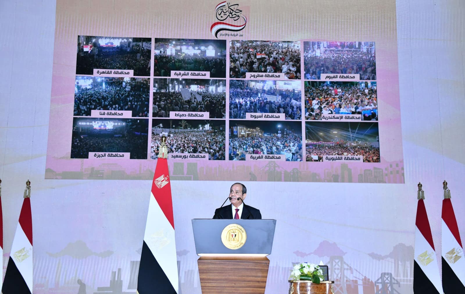 ووجه "السيسي" حديثه إلى المصريين في كلمته خلال الجلسة الختامية لمؤتمر "حكاية وطن.. بين الرؤية والإنجاز": "لقد حققنا معًا -نحن المصريين- ملحمة تاريخية، حين تجاوزنا اليأس والإحباط.. واسترددنا مصرنا العزيزة، من براثن جماعة الظلام والغدر.. ثم تجاوزنا التحدي، لكي نعيد بناء دولتنا العظيمة.. ليتحقق لأبنائها الكرامة والعدالة والتنمية".