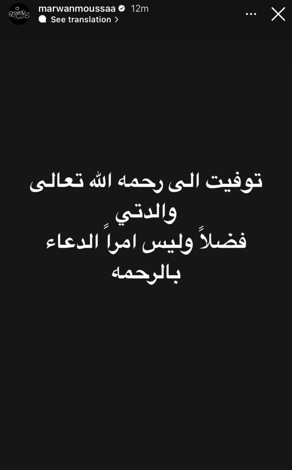 وكتب مروان موسى: توفت إلى رحمة الله تعالى والدتي، فضلا وليس أمرا الدعاء بالرحمة.