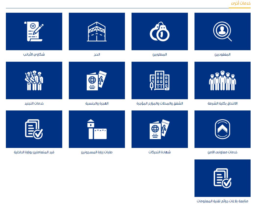 ايضا تتيح وزارة الداخلية خدمات البحث عن المفقودين، وايضا الإبلاغ عن المطلوبين أمنيا، وخدمات الحج وشكاوى الأجانب، وخدمات الالتحاق بكلية الشرطة والخدمات المتعلقة بالشقق والمحلات والمزارع المؤجرة، وكذلك خدمات الجوازات والهجرة وخدمات التجنيد وكذلك خدمات معاوني الأمن وشهادة التحركات وطلبات زيارة نزلاء مراكز الإصلاح والتأهيل، وقيد المتعاملين بوزارة الداخلية وأخيرا متابعة بلاغات جرائم تقنية المعلومات.