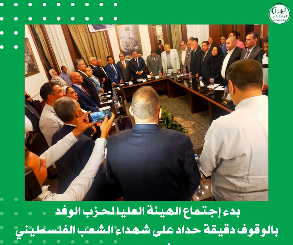 بدأ، منذ قليل، اجتماع الهيئة العليا المشترك مع نواب حزب الوفد بالوقوف دقيقة حداد علي شهداء فلسطين.