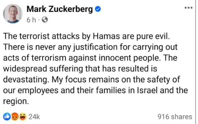 هاجم مارك زوكربيرج مالك شركة ميتا "فيسبوك" العملية التى نفذتها حركة حماس ضد الجيش الإسرائيلي متجاهلاً ما قامت به القوات الإسرائيلية من تنفيذ عمليات "إبادة" وتطهير عرقى فى حق الشعب الفلسطيني فى قطاع غزة.