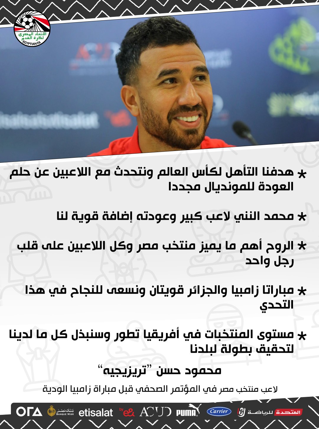 وواصل تريزيجيه: «الروح أهم ما يميز منتخب مصر، وكل اللاعبين على قلب رجل واحد، مباراتي زامبيا والجزائر قويتين ونسعى للنجاح في هذا التحدي».