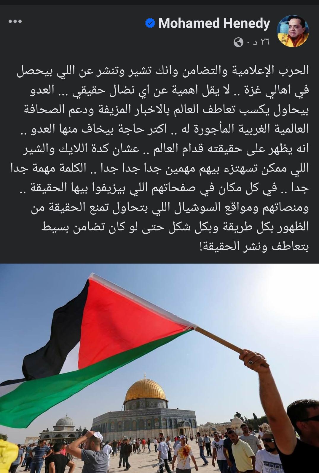 وكتب محمد هنيدي: الحرب الإعلامية والتضامن وأنك تشير وتنشر عن اللي بيحصل في أهالي غزة.. لا يقل أهمية عن أي نضال حقيقي، العدو بيحاول يكسب تعاطف العالم بالأخبار المزيفة ودعم الصحافة العالمية الغربية المأجورة له.. أكتر حاجة بيخاف منها العدو أنه يظهر على حقيقته قدام العالم.