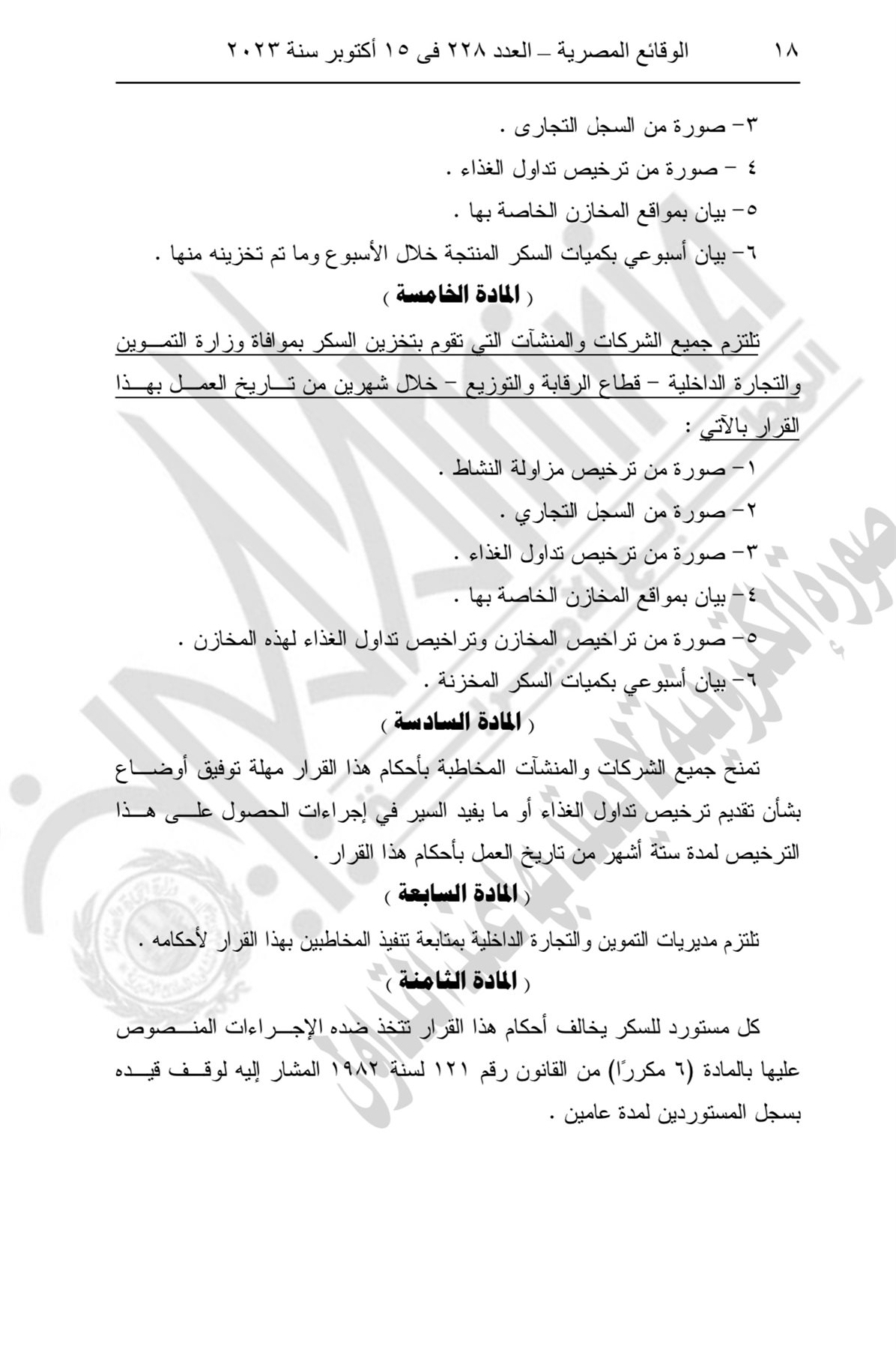 كما تلتزم جميع الشركات والمنشآت المتعاملة في إنتاج السكر بموافاة وزارة التموين خلال شهرين من تاريخ العمل بصورة من ترخيص مزاولة النشاط وصورة من السجل الصناعي وصورة من السجل التجاري وصورة من ترخيص تداول الغذاء وبيان بالمواقع الخاصة بها وبيان أسبوعي بكميات السكر المنتجة خلال الأسبوع، وما تم تخزينه منها.