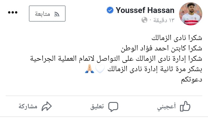 وكتب يوسف حسن عبر حسابه الرسمي على فيس بوك: «شكرا نادى الزمالك، شكرا كابتن احمد فؤاد الوطن، شكرا إدارة نادى الزمالك على التواصل لاتمام العملية الجراحية».