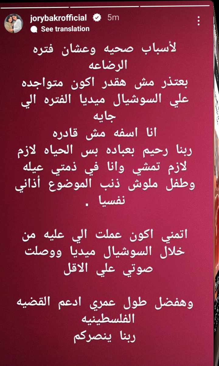 وكتبت جوري بكر عبر حسابها الرسمي بموقع تبادل الصور والفيديوهات انستجرام عبر خاصة “ستوري”: لأسباب صحية، وعشان فترة الرضاعة بعتذر مش هقدر أكون متواجدة على السوشيال ميديا الفترة اللي جاية.
