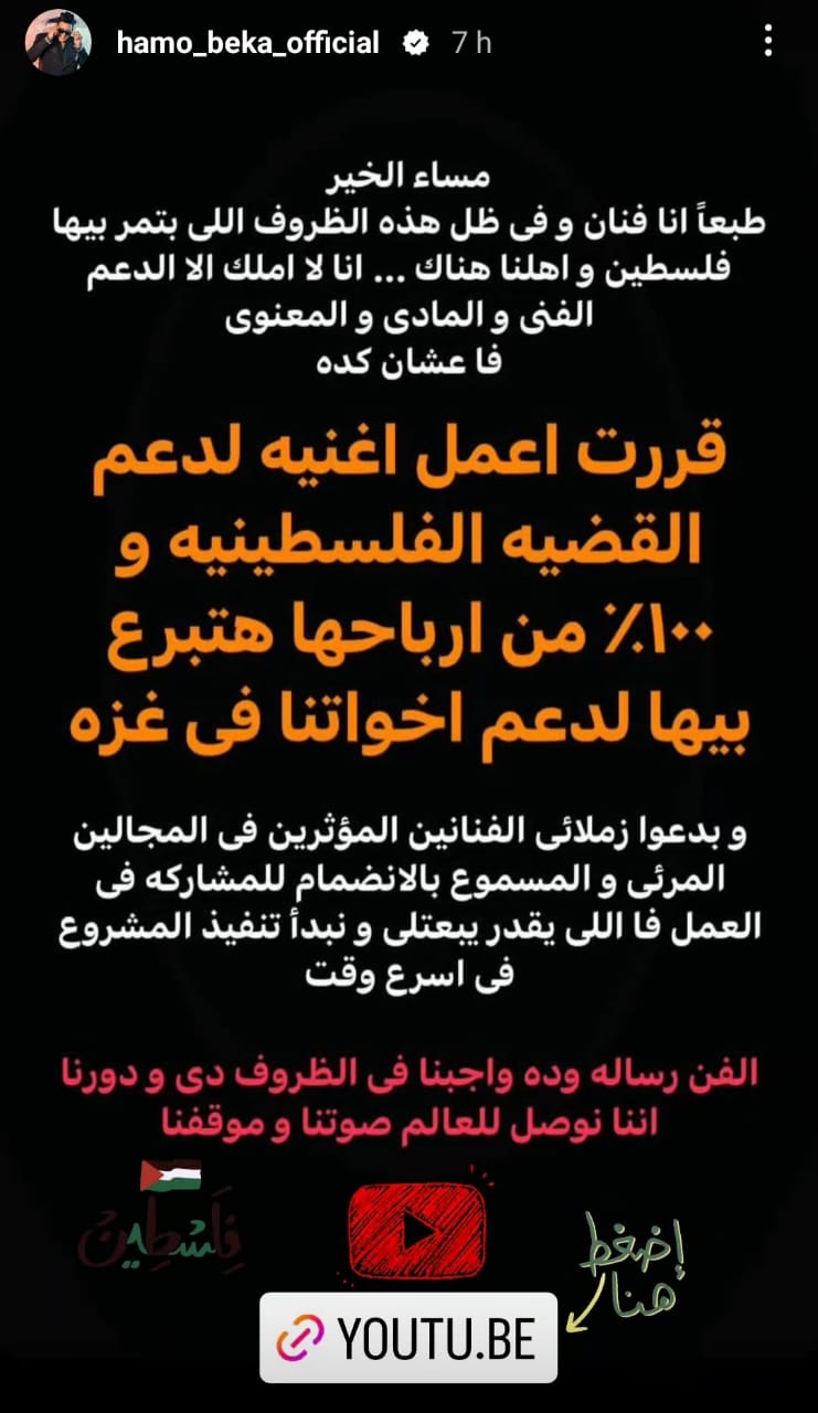 وكتب حمو بيكا خلال خاصية استوري: طبعا أنا فنان وفي ظل الظروف اللي بتمر بيها فلسطين وأهالينا هناك، أنا لا أملك إلا الدعم الفني والمادي والمعنوي، فعشان كدا، قررت أعمل أغنية لدعم القضية الفلسطينية و100٪ من أرباحها هتبرع بيها لدعم اخواتنا في غزة.