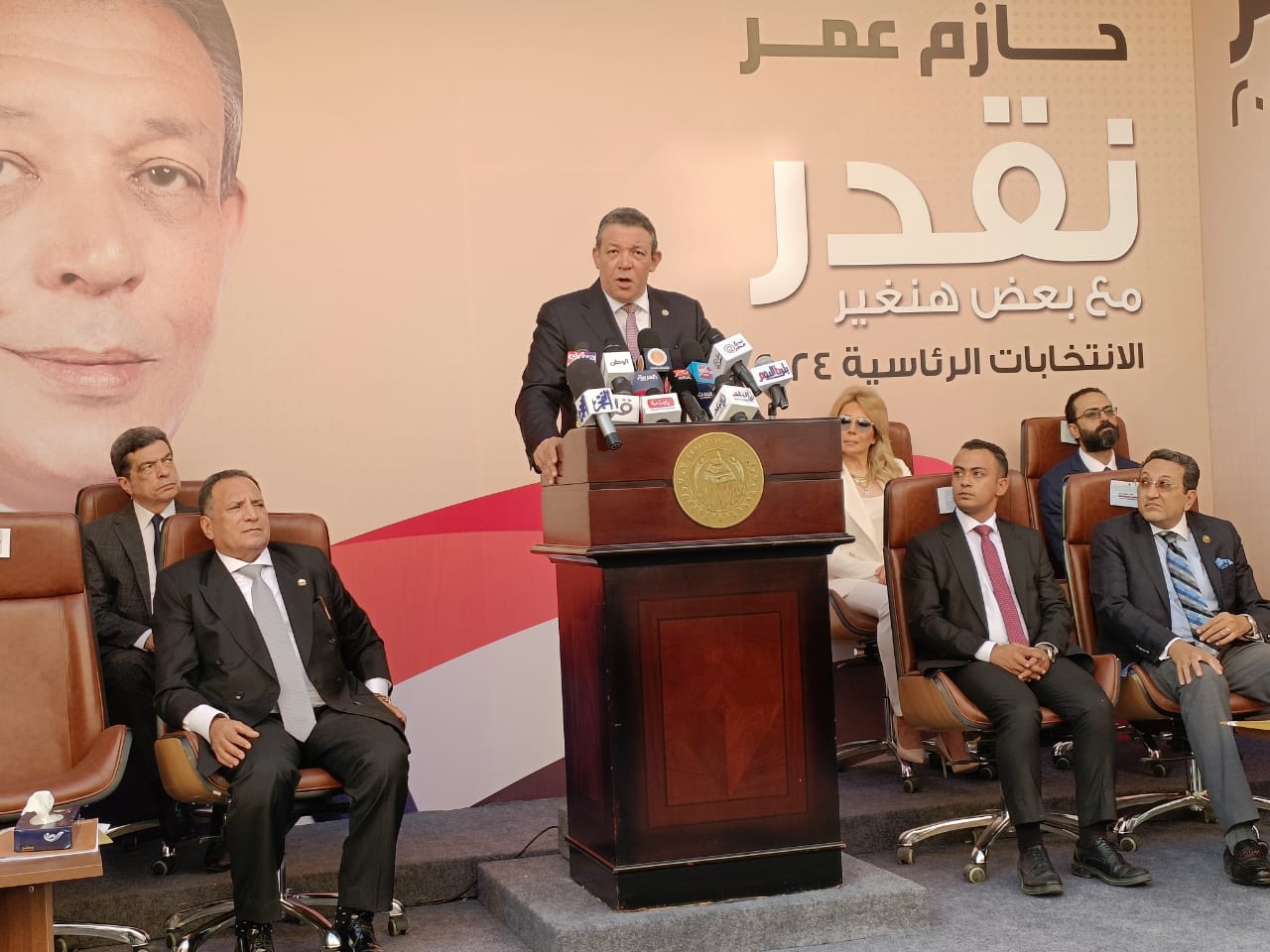 رد حازم عمر رئيس حزب الشعب الجمهوري، المرشح الرئاسي المحتمل، على سؤال الزميلة إسراء عبد المعز الصحفية بموقع تحيا مصر، بشأن ملف سد النهضة وأمن مصر المائي، وذلك خلال المؤتمر الصحفي الذي عقده بمقر حزب الشعب الجمهوري للإعلان عن تفاصيل برنامجه الانتخابي، قائلا:"لا تفريط في أمن مصر المائي".