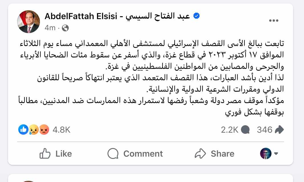 وكتب السيسي على فيس بوك: تابعت ببالغ الأسى القصف الإسرائيلي لمستشفى الأهلي المعمداني مساء يوم الثلاثاء الموافق ١٧ أكتوبر ٢٠٢٣ في قطاع غزة، والذي أسفر عن سقوط مئات الضحايا الأبرياء والجرحى والمصابين من المواطنين الفلسطينيين في غزة.