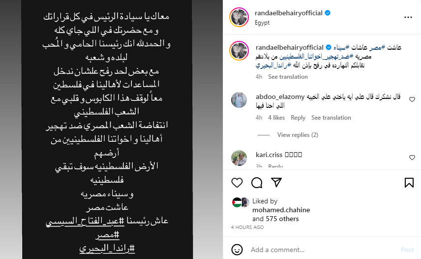 أعلنت الفنانة راندا البحيري تأييدها لـ الرئيس عبدالفتاح السيسي في جميع قراراته بشأن الأزمة الفلسطينية، رفض تهجير الفلسطينيين من أرضهم وحماية سيناء من الإعتداء الإسرائيلي، وتضامنت مع فلسطين لما تمر به.
