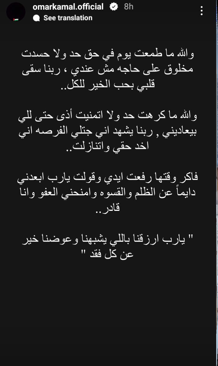 وكتب عمر كمال عبر حسابه الرسمي بموقع تبادل الصور والفيديوهات انستجرام: عمري ما طمعت في يوم في حق حد ولا حسدت مخلوق على حاجة مش عندي، ربنا سقا في قلبي بحب الخير للكل، والله ما كرهت حد ولا تمنيت أذى حتى اللي بيعاديني، ربنا يشهد اني جتلي الفرصة إني أخد حقي واتنازلت.