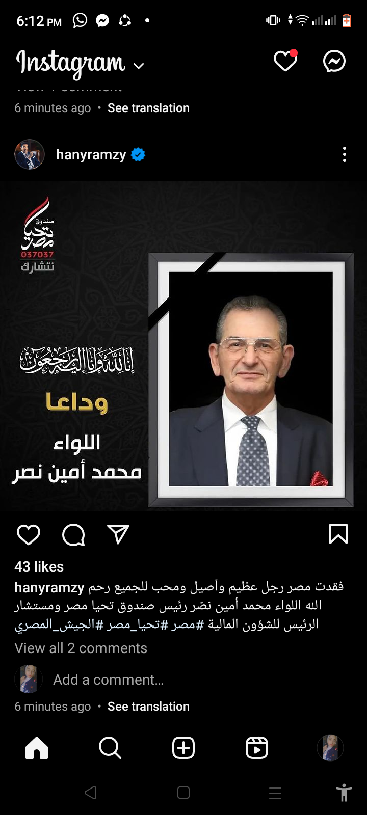 وكتب محمد أمين عبر حسابه الرسمي بموقع تبادل الصور والفيديوهات انستجرام: فقدت مصر رجل عظيم وأصيل ومحب للجميع رحم الله اللواء محمد أمين نصر مستشار رئيس الجمهورية للشئون المالية وأمين صندوق تحيا مصر.