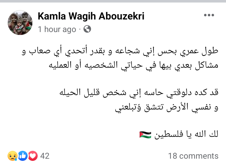 وكتبت كاملة أبو ذكرى عبر حسابها الرسمي بموقع التواصل الاجتماعي فيسبوك: طول عمري بحس إني شجاعة و بقدر أتحدي أي صعاب و مشاكل بعدي بيها في حياتي الشخصيه أو العمليه، قد كده دلوقتي حاسه إني شخص قليل الحيلة ونفسي الأرض تتشق وتبلعني.. لك الله يا فلسطين.