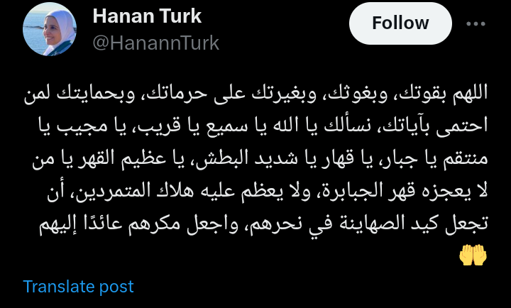 وكتبت حنان ترك على حسابها الرسمي بموقع التواصل الاجتماعي تويتر: اللهم بقوتك، وبغوثك، وبغيرتك على حرماتك، وبحمايتك لمن احتمى بآياتك، نسألك يا الله يا سميع يا قريب، يا مجيب يا منتقم يا جبار، يا قهار يا شديد البطش، يا عظيم القهر يا من لا يعجزه قهر الجبابرة، ولا يعظم عليه هلاك المتمردين، أن تجعل كيد الصهاينة في نحرهم، واجعل مكرهم عائدًا إليهم.
