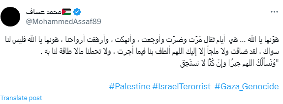 نشر محمد عساف عبر حسابه الرسمي بموقع التغريدات إكس "تويتر سابقًا"، وقال: "هوّنها يا الله هي أيام ثقال مَرّت وضرّت وأوجعت، وأنهكت، وأرهقت أرواحنا، هونها يا الله فليس لنا سواك، لقد ضاقت ولا ملجأ إلا إليك اللهم ألطف بنا فيما أجرت، ولا تحملنا مالا طاقة لنا به، وَنَسألُكَ اللهم جبرًا وإنْ كُنَّا لا نستَحِق".