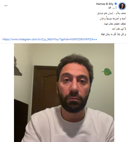 وعلق الفنان حمزة العيلي على الفيديو الذي نشره محمد سلام، عن موقفه من المشاركة في موسم الرياض من خلال مسرحية زواج اصطناعي، ونشر حمزة العيلي منشور له عبر حسابه الرسمي بموقع التواصل الاجتماعي الفيس بوك، وقال: "محمد سلام إنسان نقي صادق.. أحبه واحترمه صديق وفنان.. موقف حقيقي بمقام جهاد.. لا لوم على أحد.. ولكن هذا أقل ما يمكن فعله".