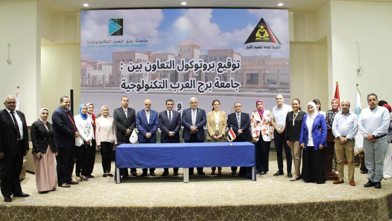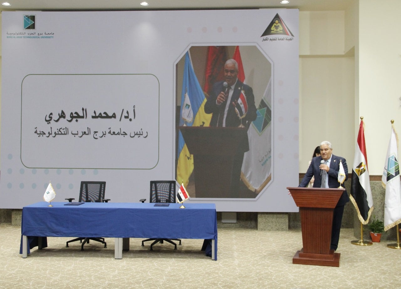 وقع بروتوكول التعاون، د. محمد مرسي الجوهري، رئيس جامعة برج العرب التكنولوجية، ود. محمد يحي ناصف، رئيس الجهاز التنفيذي للهيئة العامة لتعليم الكبار.