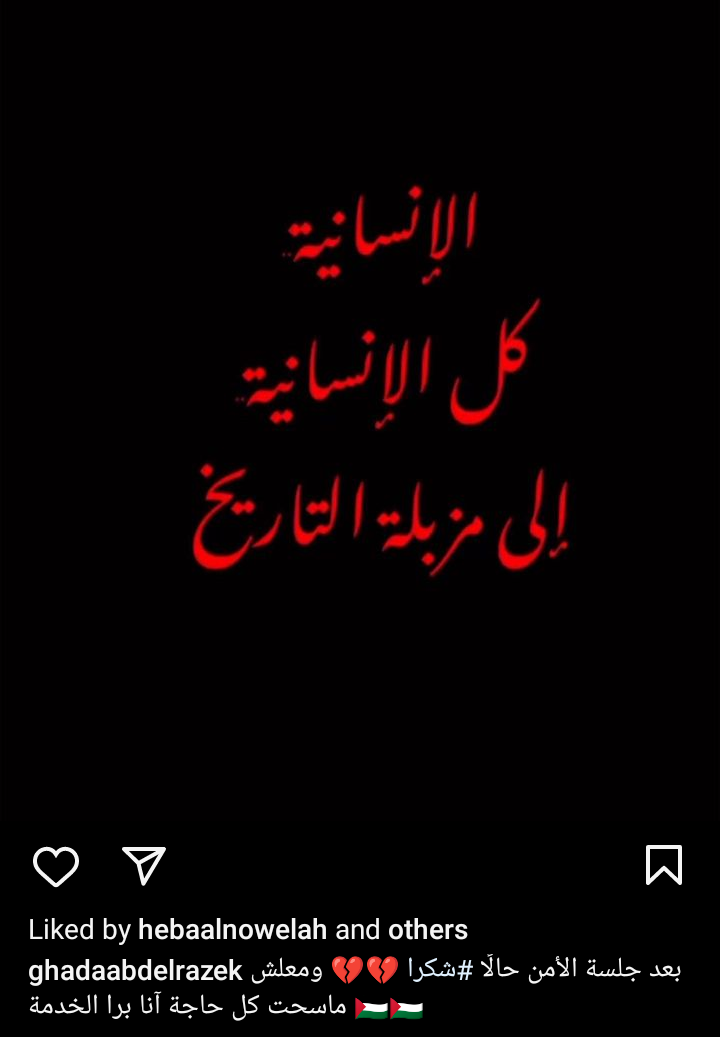 ونشرت غادة عبد الرازق صورة عبر حسابها الرسمي بموقع تبادل الصور والفيديوهات انستجرام، كتب عليها: الإنسانية، كل الإنسانية إلى مزبلة التاريخ، وعلقت الفنانة الكبيرة على الصورة وقالت: معلش مسحت كل حاجة انا برة الخدمة.