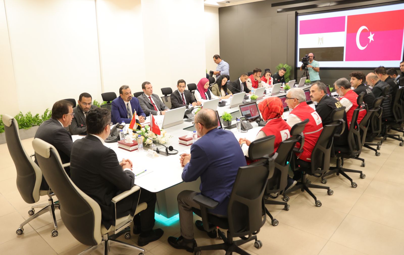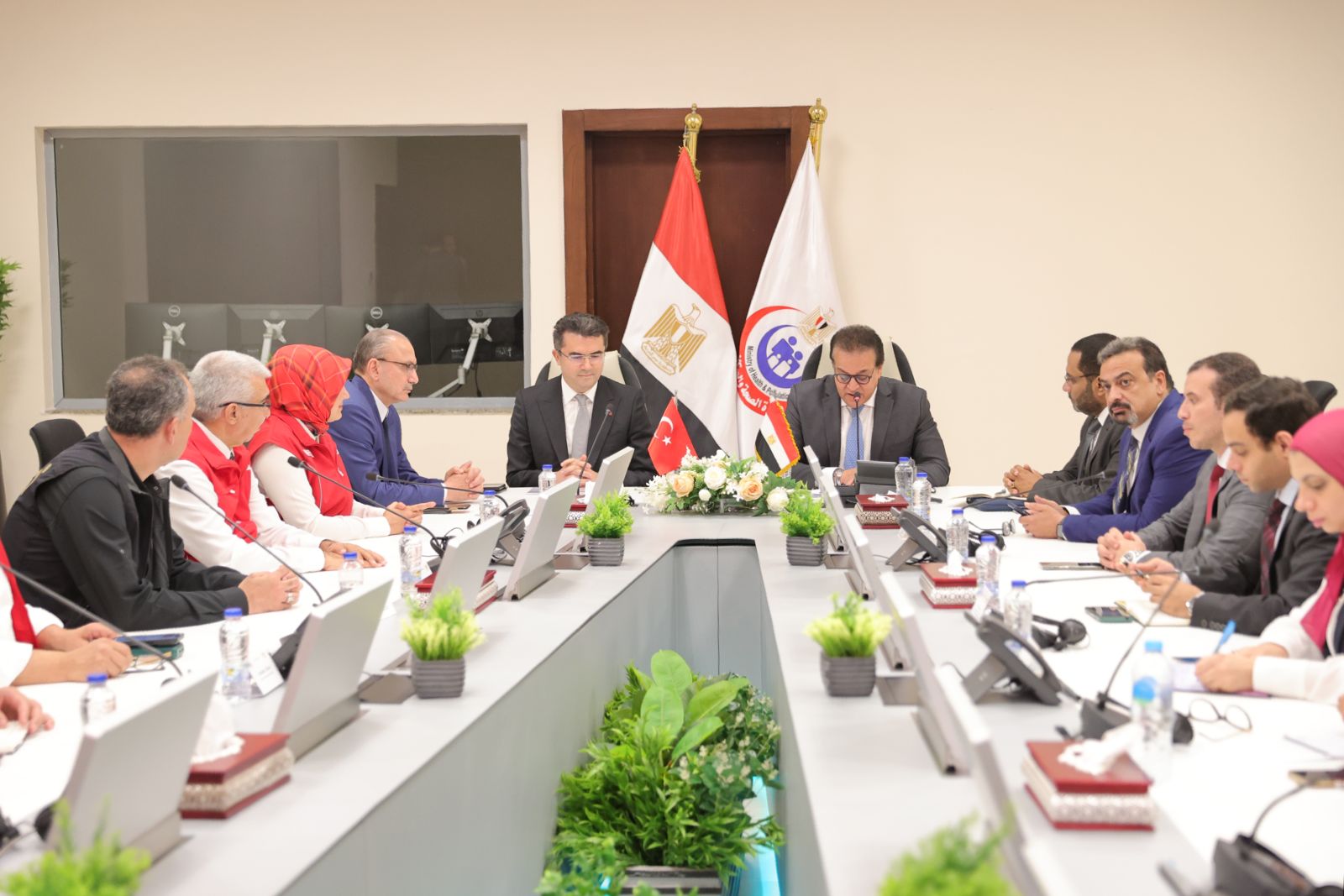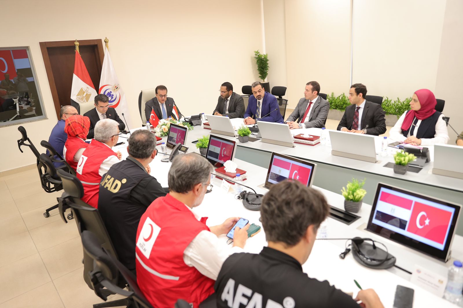 استقبل الدكتور خالد عبد الغفار وزير الصحة والسكان، أوكاي ميميش محافظ ورئيس هيئة الكوارث والطوارئ التركي AFAD وصالح موطلو شن، السفير التركي لدى جمهورية مصر العربية، والدكتورة فاطمة يلماز، رئيس جمعية الهلال الأحمر التركي، والوفد المرافق لهم، بغرفة إدارة الأزمات والطوارئ بمقر الوزارة بالعاصمة الإدارية الجديدة، وذلك لبحث سبل التعاون بين البلدين لإيصال المساعدات الطبية لأهالي غزة، ووسائل تقديم الدعم الطبي لهم .