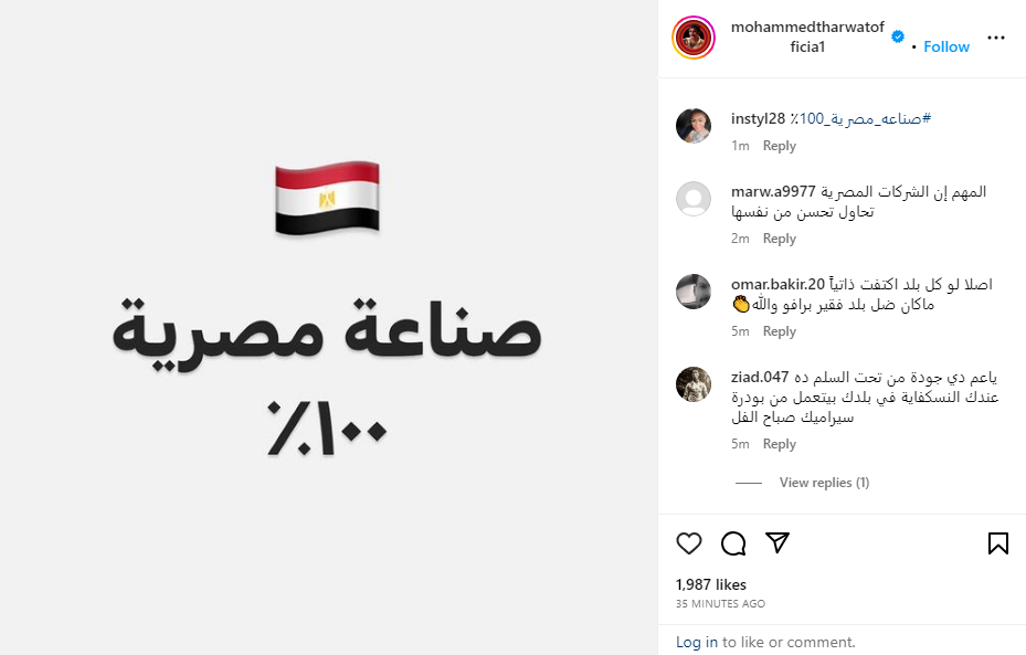 وكتب محمد ثروت عبر حسابه الرسمي بموقع انستجرام: المقاطعة مش معناها إنك تلاقي بديل بنفس الجودة، المقاطعة إنك تستغني عن اللي بتحبه عشان تنتصر لمبادئك، يلا ندعم المنتج المحلي ونخلي كل استهلاكنا من منتجات مصرية 100 ٪.
