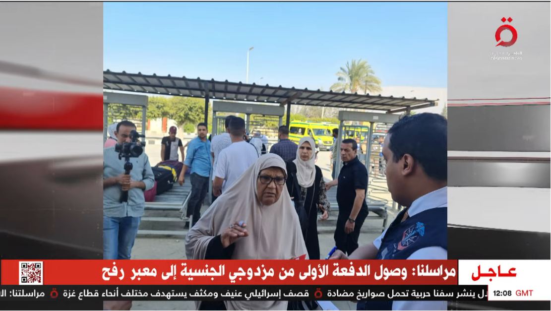 أفادت قناة القاهرة الإخبارية، بوصول الدفعة الأولى من مزدوجي الجنسية إلى معبر رفح، ويأتي هذا فى إطار جهود مصرية حثيثة لمساعدة سكان غزة الذي يواجهون ظروف إنسانية كارثية مع استمرار القصف الإسرائيلي المتواصل ضد القطاع واستهداف المدنيين والتى أسفر عنها مقتل أكثر من 8 آلاف مواطن وأكثر من نصف القطاع البالغ عدده 2 مليون أصبحوا بلا مأوي بسبب القصف الإسرائيلي.