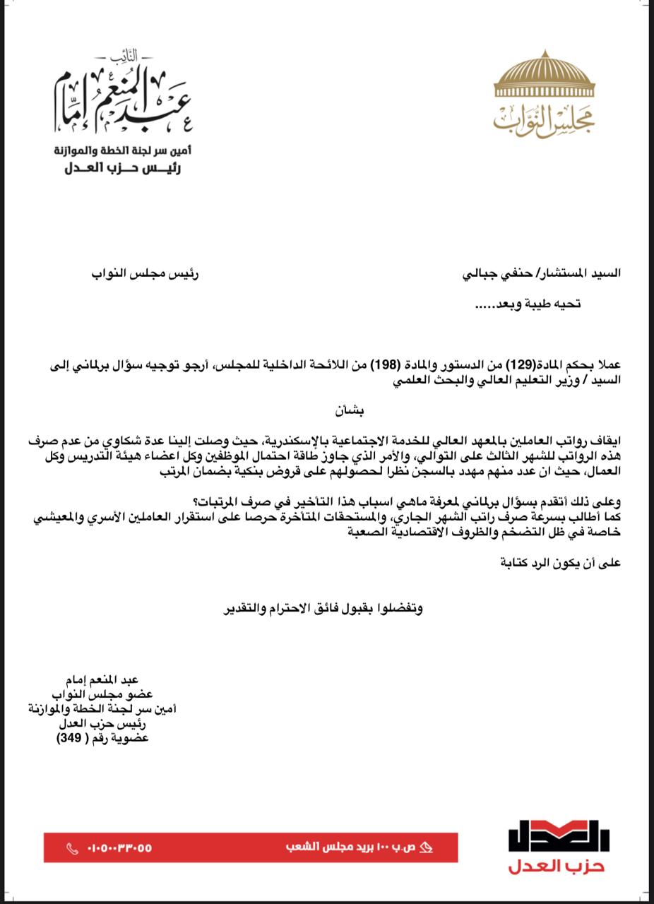 تقدم النائب عبد المنعم إمام، أمين سر لجنة الخطة والموازنة ورئيس حزب العدل، بسؤال برلماني موجه إلى وزير التعليم العالي، بشأن عدم صرف رواتب العاملين بالمعهد العالي للخدمة الاجتماعية بالاسكندرية، حيث أن هناك عدة شكاوي من عدم صرف هذه الرواتب للشهر الثالث على التوالي، والأمر الذي جاوز طاقة احتمال الموظفين وكل أعضاء هيئة التدريس وكل العمال، حيث أن عدد منهم مهدد بالسجن نظرًا لحصولهم على قروض بنكية بضمان المرتب.