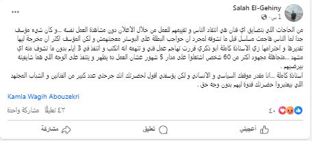 وتابع صلاح الجهيني حديثها قائلًا: "متجاهلة مجهود أكتر من 60 شخص اشتغلوا على مدار 5 شهور، عشان العمل ده يظهر ويتنفذ على الوجه اللي هما شايفينه بيرضيهم، أستاذة كاملة أنا مقدر موقفك السياسي والإنساني، ولكن يؤسفني أقول لحضرتك أنك جرحتي عدد كبير من الفنانين والشباب المجتهد، اللي بيعتبروا حضرتك قدوة لهم بدون وجه حق".