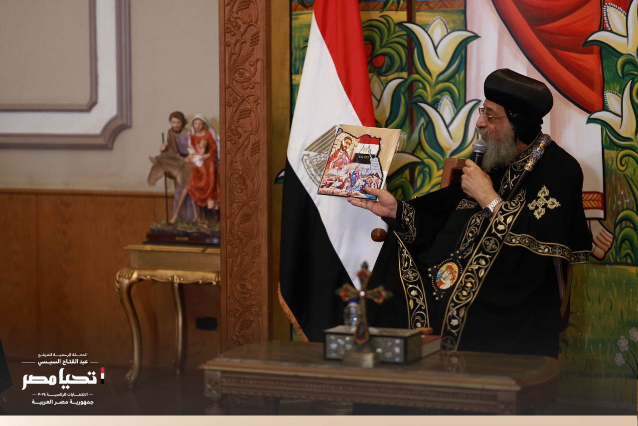 عبر المستشار محمود فوزي، رئيس الحملة الانتخابية للمرشح الرئاسي عبد الفتاح السيسي، عن تقديره العميق للدور الوطني العظيم للكنيسة في نجاح ثورة ٣٠ يونيو، التي اتخذت موقفًا واضحًا في الدفاع عن الوطن، وبث روح الوحدة ومحاربة الاستقطاب، واستعادة روح الوطن الذي سرق، فساهمت بذلك في تثبيت أركان الدولة، واستقراراها، مثمنًا الدور الوطني البارز الذي يقوم به قداسة البابا في نشر المعلومات والتوعية بتطور أوضاع الأقباط في مصر بعد عام 2013 فضلًا عن تصريحات قداسة البابا المنحازة دائمًا للوطن داخليًا وخارجيًا، مثنيًا كذلك على دوره الوطني الكبير في الحفاظ على الدولة من الانزلاق إلى حالة من الاستقطاب الطائفي، وتحييد أي محاولة لإثارة الفتن في مصر.