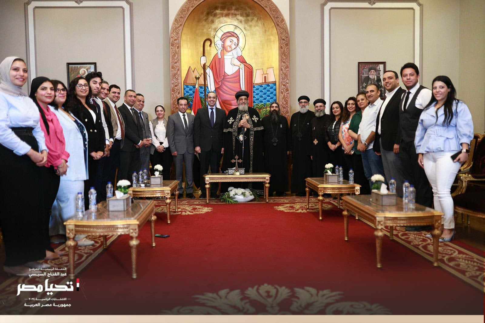 "شباب وسيدات، رموز العمل السياسي والإعلامي، ممثلو تيارات شعبية وحزبية وطنية"، الجميع يلتف حول طاولة الحملة الرسمية للمرشح الرئاسي عبد الفتاح السيسي، حيث صولات وجولات ناجحة للقاء كافة أطياف المجتمع المصري، وقد جاءت أحدث المحطات الخاصة بمسار الحملة، متعقا بزيارة خاصة مع البابا تواضروس الثاني بابا الإسكندرية بطريرك الكرازة المرقسية، في المقر البابوي بالقاهرة.