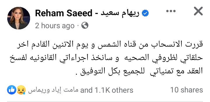 جدير بالذكر، أن تلك ليست المرة الأولى الإعلامية ريهام سعيد في الانسحاب من قناة الشمس، فسبق وكتبت عبر حسابها الرسمي بموقع التواصل الاجتماعي فيسبوك: أنا بعلن انسحابي من قناة الشمس لظروف شخصية وعايزة أقول إني اشتغلت مع أكتر ناس محترمة في الدنيا .. وبتمنى التوفيق للجميع.